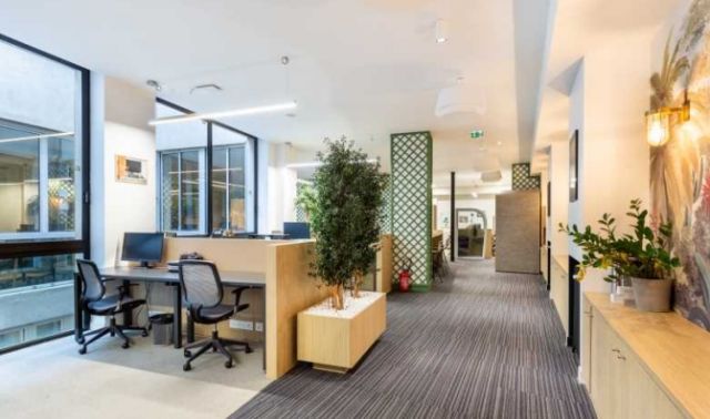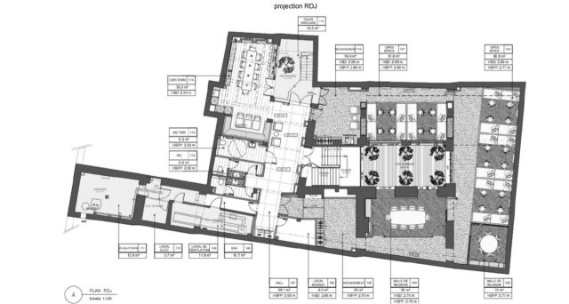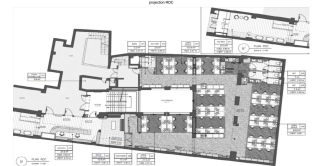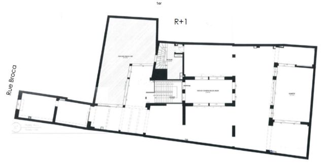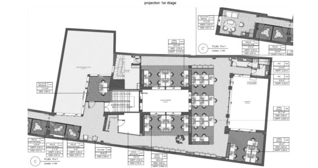 En R+1 et sous-sol, 930 m² de bureaux répartis en 1 accueil/espace attente, espaces ouverts/bureaux cloisonnés, salles de réunion et 1 kitchenette.