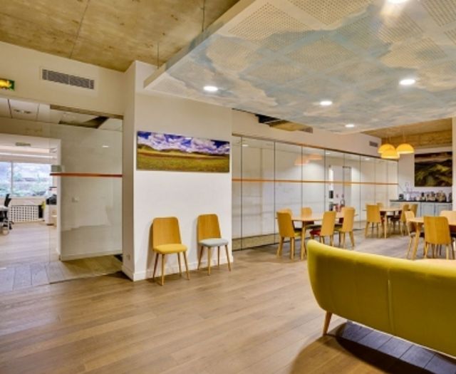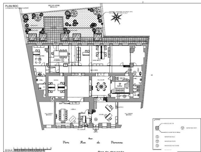 Au rez-de-chaussée et rez-de-jardin, 859 m² de bureaux répartis en espaces ouverts et cloisonnés.