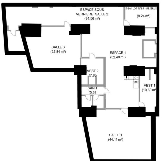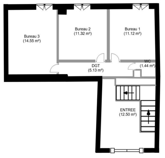 Au rez-de-chaussée, 56,06 m² composés de : 1 accueil, 3 bureaux fermés avec fenêtre sur cour, sanitaires
