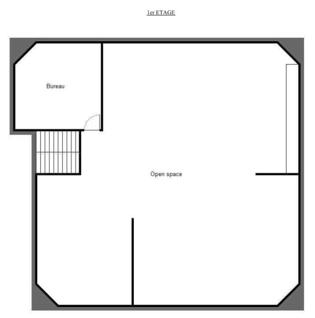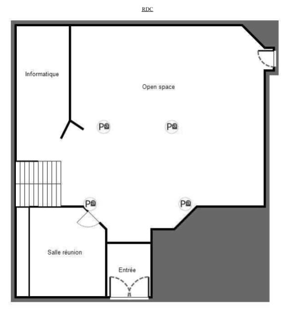 Au RDC : 88 m² de bureaux répartis en un accueil, un bureau fermé, un grand espace ouvert et un espace reprographie et informatique, pas d'éclairage naturel sur cette partie des bureaux à l'exclusion d'une partie vitrée entre le RDC et le premier étage.
