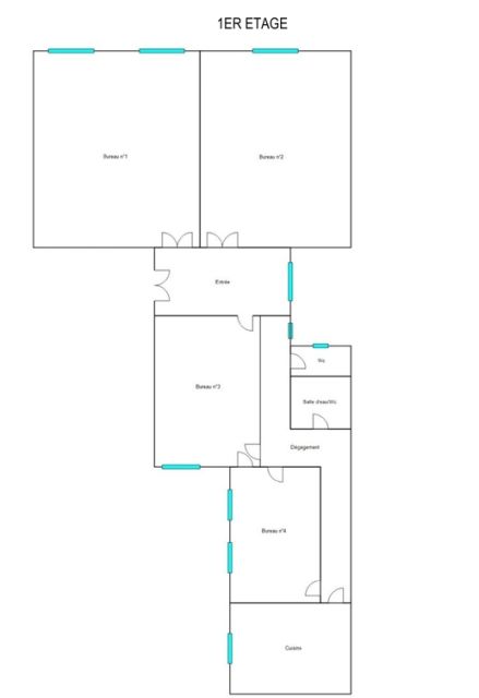 Au 1er étage, 139 m² de bureaux répartis en un accueil, 3 bureaux, 1 salle de réunion, 2 sanitaires lavabos, 1 coin cuisine.