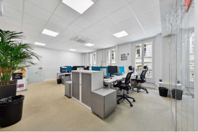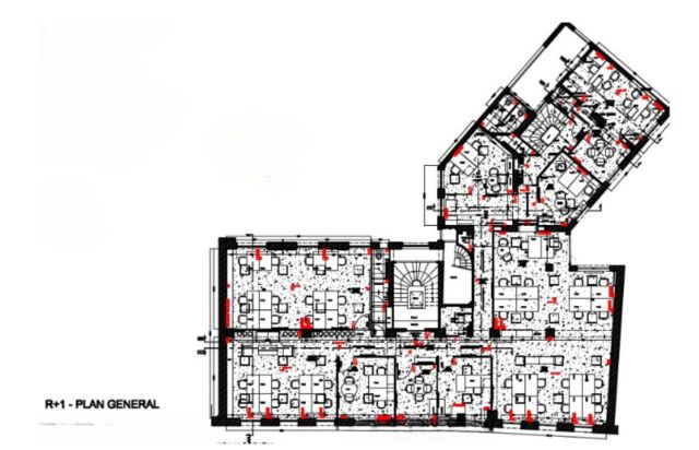 En R+2, 698,87 m² de bureaux répartis en espaces ouverts et cloisonnés.