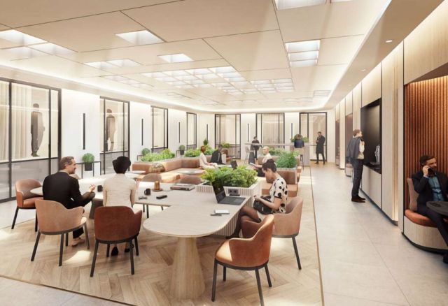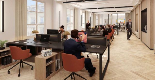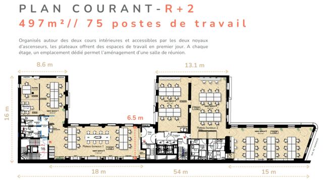 Les espaces de travail, agencés autour de deux cours intérieures verdoyantes, ont été conçus pour être adaptables, répondant ainsi aux besoins des entreprises soucieuses du bien-être de leurs employés, tout en respectant les normes internationales et les nouvelles pratiques de travail.
