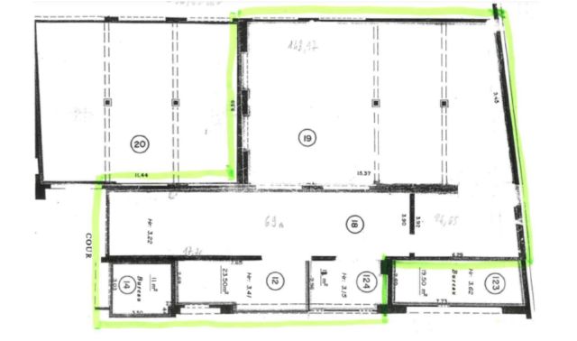 Au rez-de-chaussée, 222 m² de bureaux donnant sur une cour intérieure et répartis en espaces ouverts et bureaux cloisonnés. ERPable.
