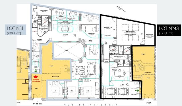 Au rez-de-chaussée et sous-sol, 454,20 m² de bureaux ERP, répartis en accueil avec espace dattente, espaces cloisonnés, sanitaire PMR