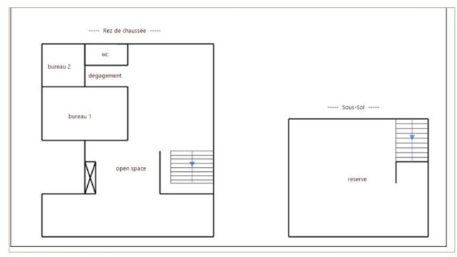 Au rez-de-chaussée et sous-sol, 240 m² de bureaux et stockage répartis en espaces ouverts et cloisonnés.