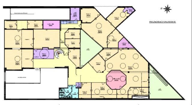 Au rez-de-chaussée et sous-sol, 612 m² de bureaux atypiques et archives, répartis en espaces ouverts et cloisonnés.