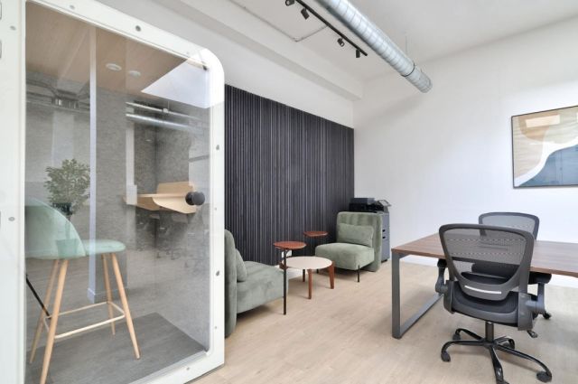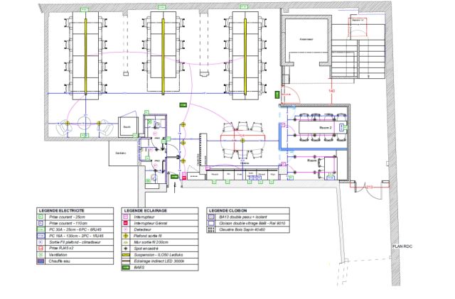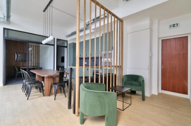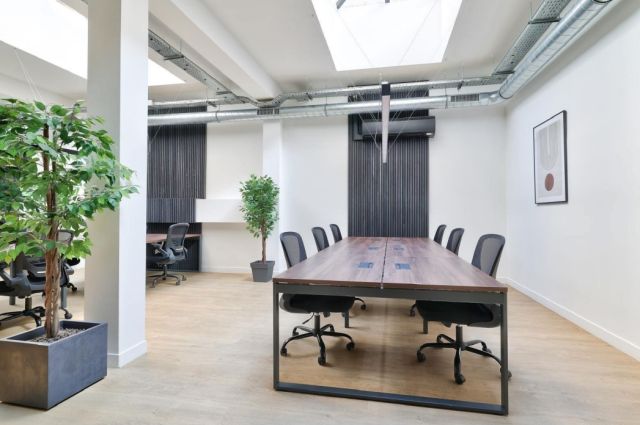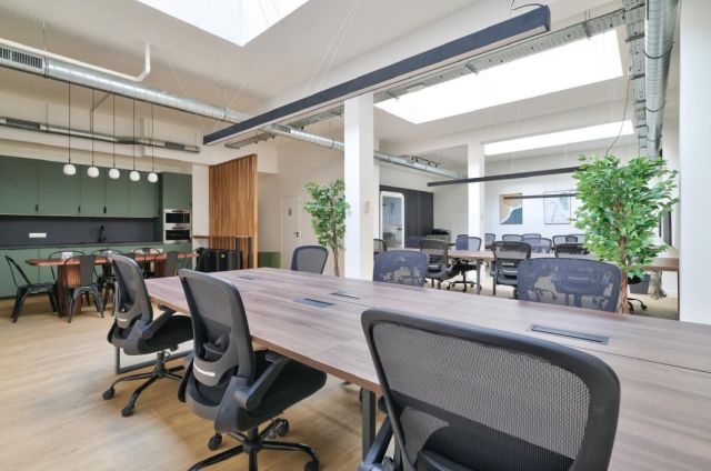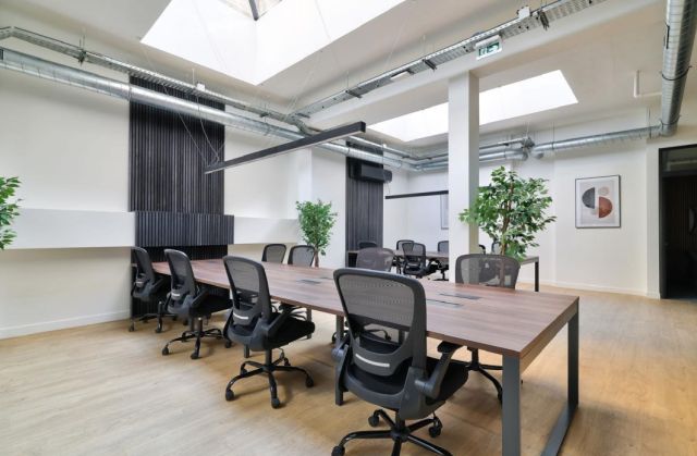 Au rez-de-chaussée, 120 m² de bureaux répartis en une entrée avec petit espace dattente, un grand espace ouvert sous puits de lumière, salle de réunion, cuisine avec espace de repos, sanitaires.