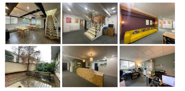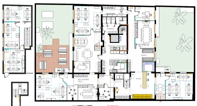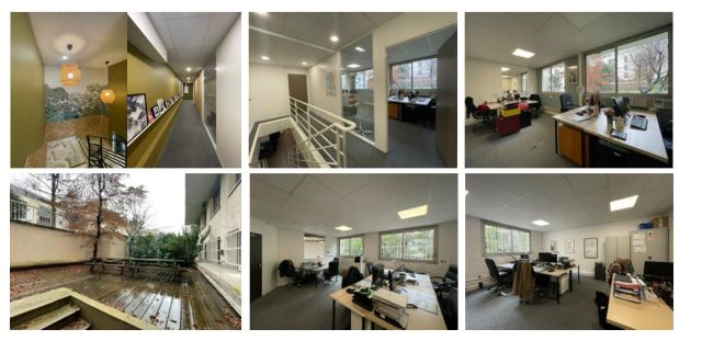 Au rez-de-chaussée et sous-sol, 456 m² de bureaux répartis en espaces ouverts et cloisonnés.