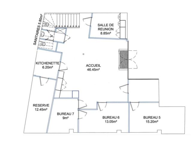 Au rez-de-chaussée et 1er étage, 213,20 m² de bureaux répartis en un grand accueil, nombreux bureaux, salle de réunion, kitchenette, 2 sanitaires.