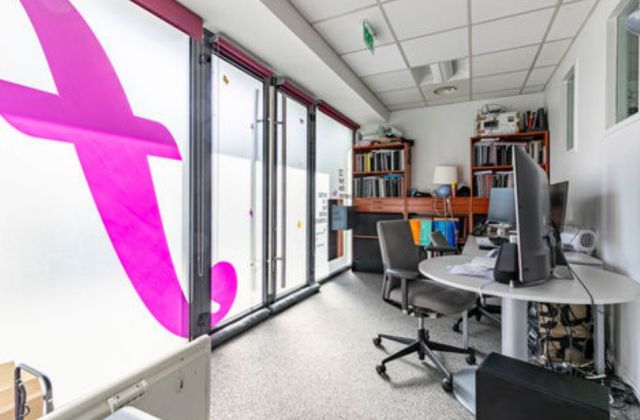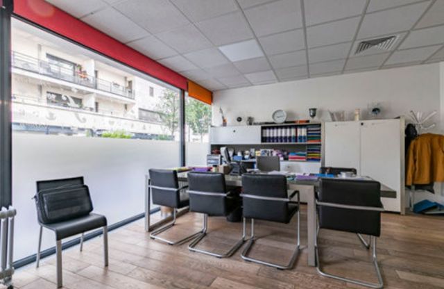 Au rez-de-chaussée, 213,43 m² de bureaux répartis en espaces ouverts et cloisonnés, kitchenette, 2 sanitaires.
