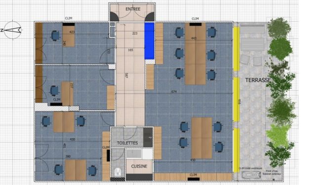 Au 1er étage, 102 m² de bureaux trés lumineux, répartis en une entrée-réception, 3 bureaux sur jardin, sanitaire avec wc et lavabo, kitchenette, un grand open-space donnant sur une terrasse de 25,8 m2.