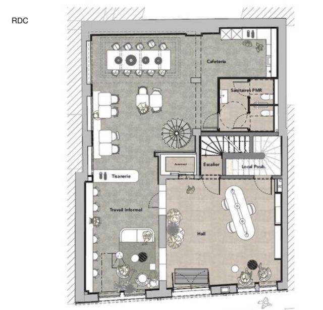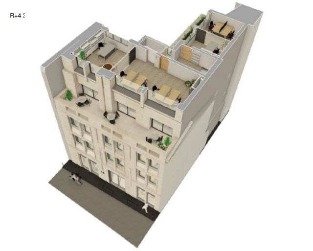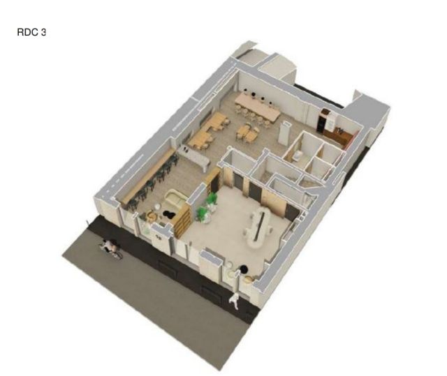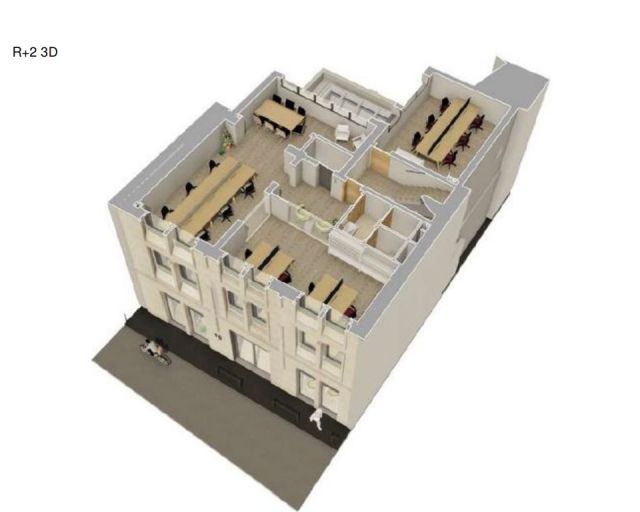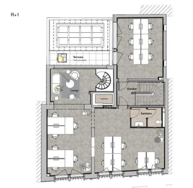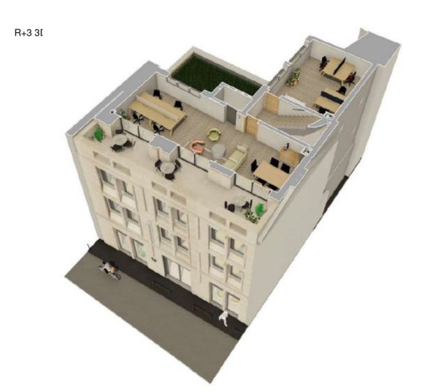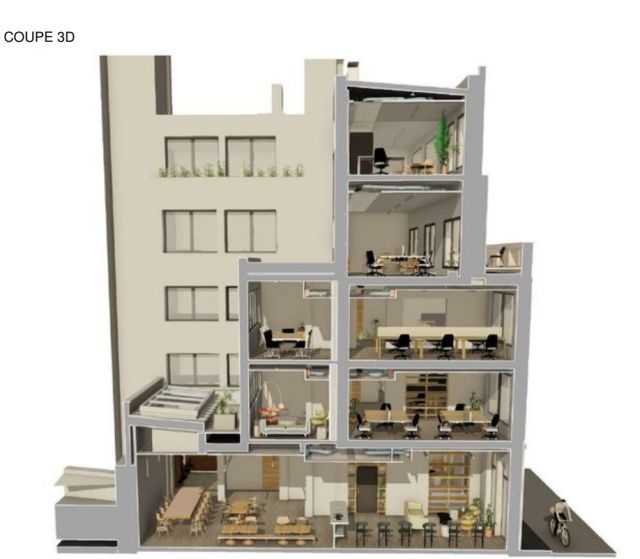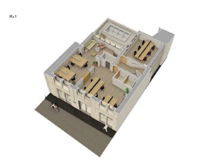 En R+3, 477 m² de bureaux répartis en un espace accueil, espaces ouverts et bureaux cloisonnés.