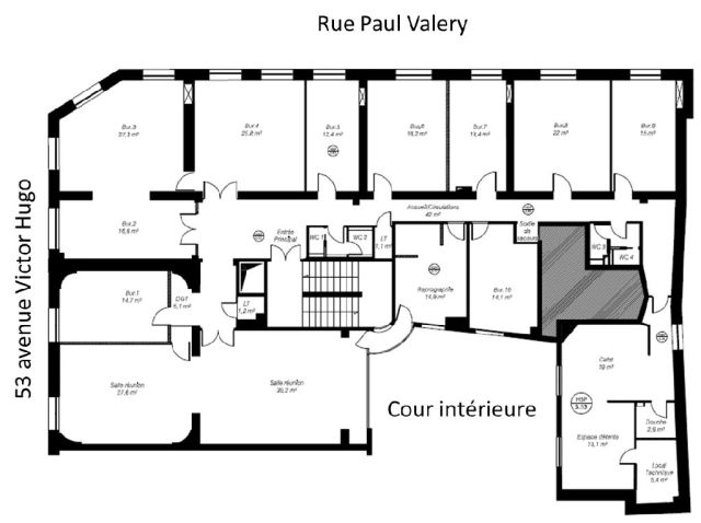 Au 2ème étage, les bureaux comprennent un bel accueil, 9 bureaux, 2 salles de réunion dont une grande, 2 double sanitaires, douche, coin détente avec cuisine équipée et local informatique .
