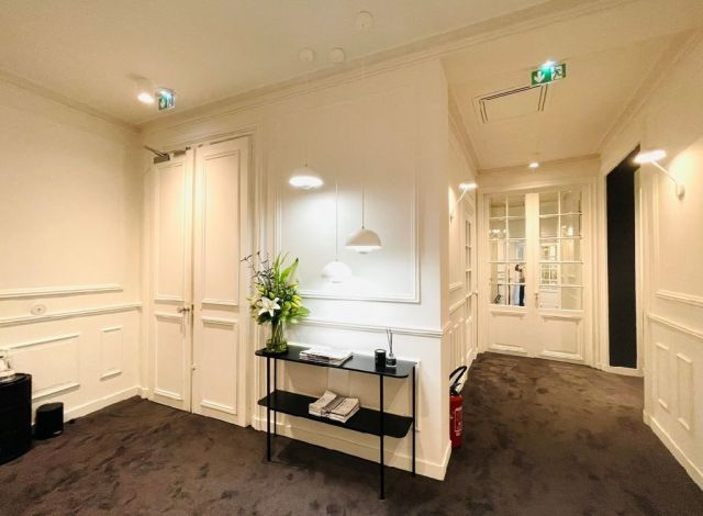 Moquette, moulures dans les bureaux et les salles de réunion, plafonds en staff avec spots encastrés dans les circulations .
