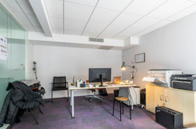 RDC : un grand bureau avec une belle hauteur sous plafond, un espace ouvert et un bureau avec un cloisonnement vitré, 2 sanitaires et une kitchenette.