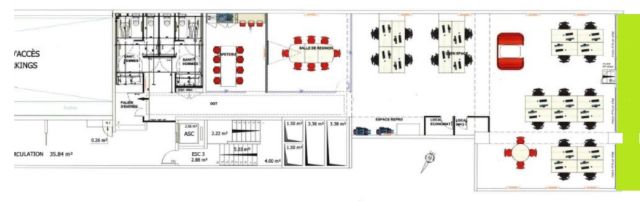 Au rez-de-chaussée, 238 m² de bureaux répartis en grand espace ouvert, salle de réunion, espace cuisine aménagé.