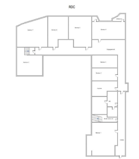 Au rez-de-chaussée et sous-sol, 196 m² de bureaux répartis en un accueil, 7 bureaux, une cuisine, un espace WC lavabo, une remise (ancienne cuisine) et 2 petits locaux techniques, sous-sol sein relié par un escalier intérieur.