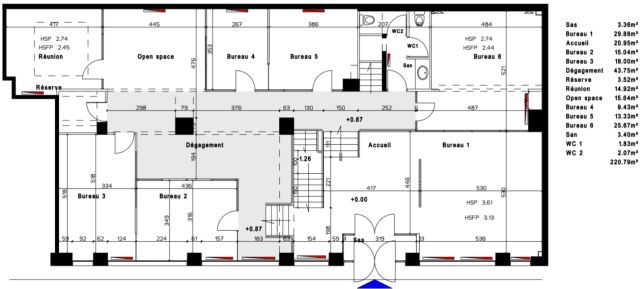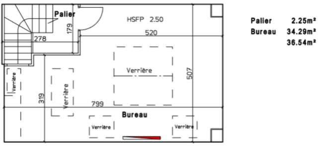 Au rez-de-chaussée, 1er étage et sous-sol, 458 m² de bureaux répartis en espaces ouverts et cloisonnés.