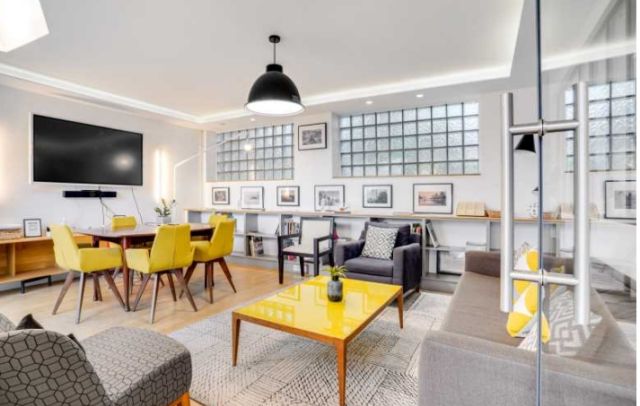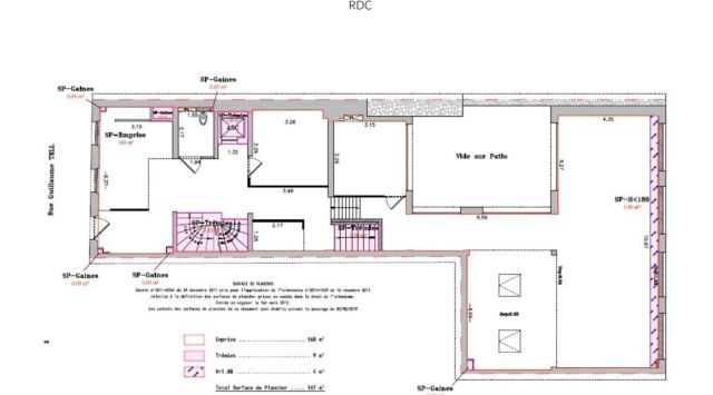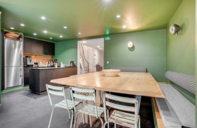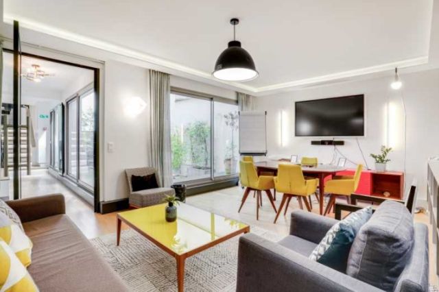 Rez de patio actuellement organisé en espace détente / cuisine, 5 salles de réunion (dont une grande), locaux techniques et douche et sanitaire.