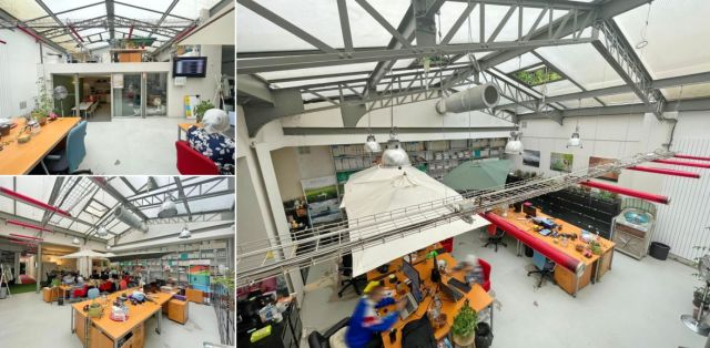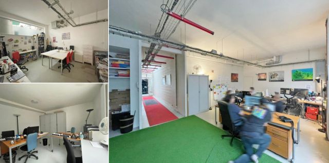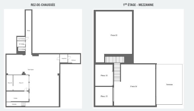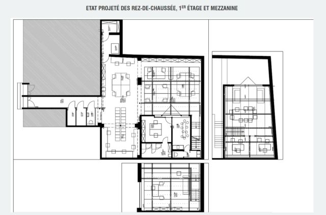 Au rez-de-chaussée et 1er étage, 307,14 m² de bureaux atypiques répartis en espaces ouverts et bureaux avec cloisonnement léger.